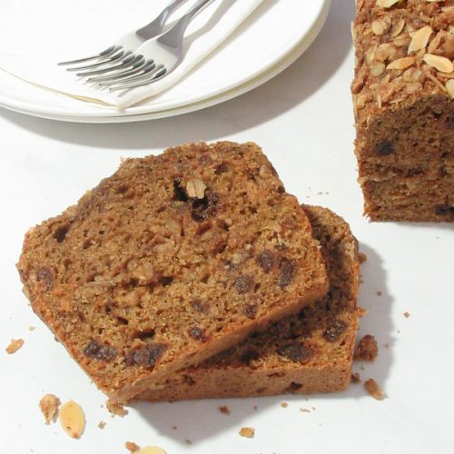 For this recipe, I added pieces of dried apricot to the quick bread batter, flavoured it with almond extract, and topped the whole thing with a layer of oaty streusel and flaked almonds.