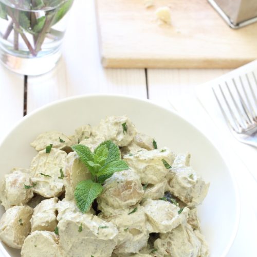 This is my twist on a classic summer side dish – fresh, creamy potato salad with mint pesto dressing – heavy on the flavour (mmm, mint!) yet light (i.e. none) on the mayonnaise – the perfect side dish for all your warm weather eating!