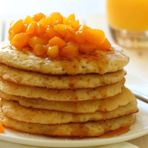 Usually, I eat my pancakes with butter and syrup (I’m nothing if not a creature of habit…) But I’ve found syrup difficult to photograph unless you use half a bottle’s worth at a time – far too sweet (and expensive!) for me. Instead, I poached some diced apricots in a splash of orange juice, and added vanilla extract to make a fruity, not-too-sweet topping (then ended up drizzling maple syrup and sprinkling icing sugar to prettify it, oh well…)